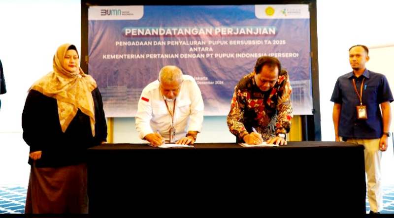 JAKARTA – Kementerian Pertanian (Kementan) dan Pupuk Indonesia Holding Company (PIHC) melakukan penandatanganan kontrak pengadaan dan penyaluran pupuk bersubsidi tahun 2025. Penandatanganan kontrak antara Direktorat Jenderal Prasarana dan Sarana Pertanian (Ditjen PSP) dan PT Pupuk Indonesia dilakukan di Hotel Aston, Jakarta, Selasa 24 Desember 2024.