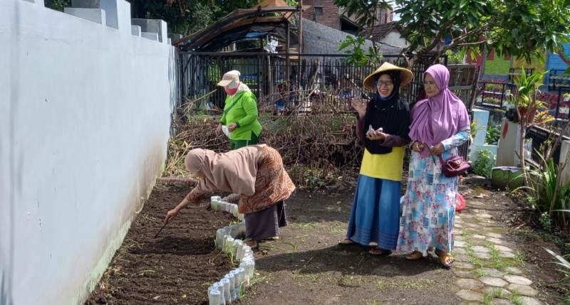 ”Daripada botol dibuang begitu saja, maka kita manfaatkan untuk mempercantik kebun dengan menyulapnya menjadi pot-pot kecil yang disusun rapi di pagar-pagar kebun. Tak hanya digunakan sebagai pot, beberapa botol juga dimodifikasi menjadi alat penyiram dan wadah pupuk organik cair. Dan memanfaatkan sampah organik sekitar lahan sebagai kompos. Kita tunjukkan bahwa berkebun bisa dimulai dari hal sederhana dan murah,” jelas Khalimah, pada Sabtu (07/07) lalu.