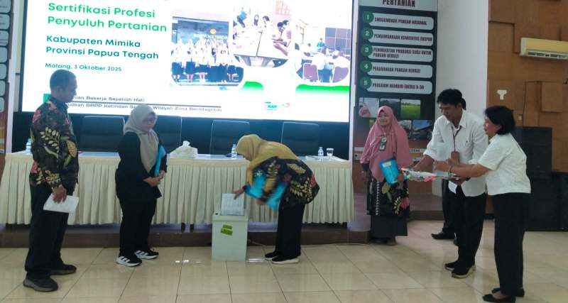 Malang — Balai Besar Pelatihan Pertanian (BBPP) Ketindan resmi menutup kegiatan sertifikasi penyuluh pertanian kerjasama dengan Kabupaten Mimika, Provinsi Papua, pada Jum’at, (2/10/2025). Melalui serangkaian proses sertifikasi yang panjang, 30 orang peserta dinyatakan kompeten.
