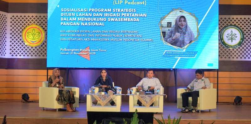 MALANG– Sebanyak 80 peserta yang berasal dari Kesatuan Aksi Mahasiswa Muslim Indonesia (KAMMI) dan Mahasiswa/ Mahasiswi Politeknik Pembangunan Pertanian (Polbangtan) Malang antusias menghadiri kegiatan Sosialisasi Program Strategis Ditjen Lahan dan Irigasi Pertanian dalam Mendukung Swasembada Pangan Nasional, Jumat (21/11/2025)